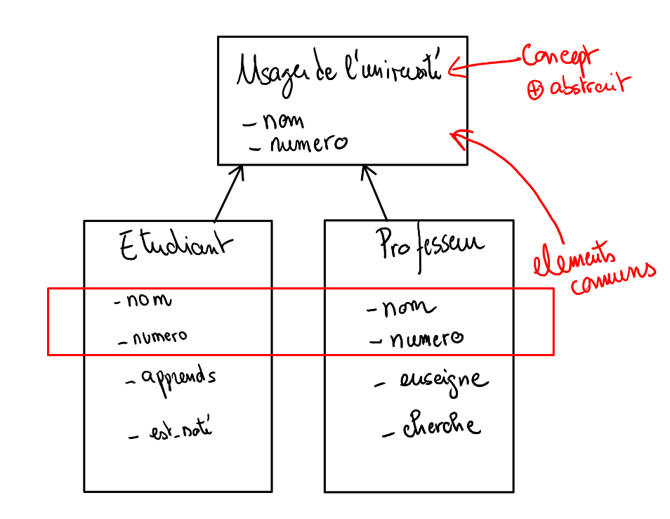 On voit donc qu'il exsite un concept plus abstrait dans notre modèle Usager de l'université qui regroupes les caractéristiques communes des deux classes.