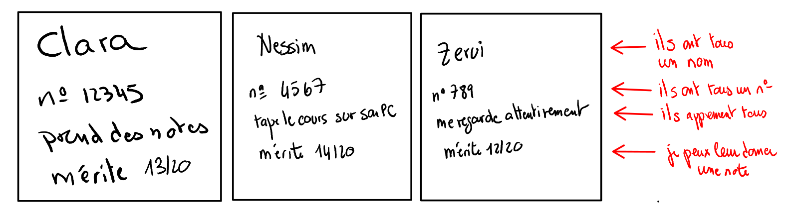 - les méthodes (le code exécuté, qui est exécuté de la même manière pour chaque étudiant)