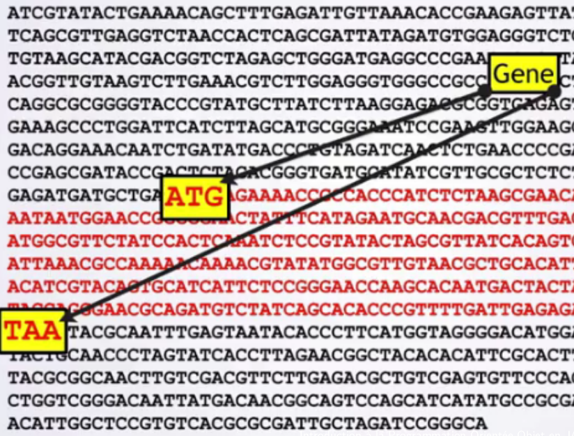 - Gène: tous les codons entre un start codon et un stop codon (inclus)